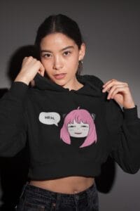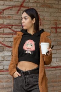 Women’s Black Cropped Hoodie with Anya Spy X Family Anime Print – Trendy Cotton Hoodie